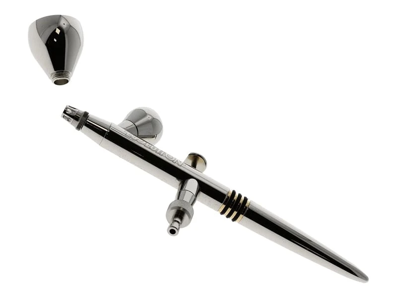 Aérographe entièrement métallique double action, buse flottante à centrage automatique interchangeable. 2 godets réservoir environ 2 ml et 5 ml.