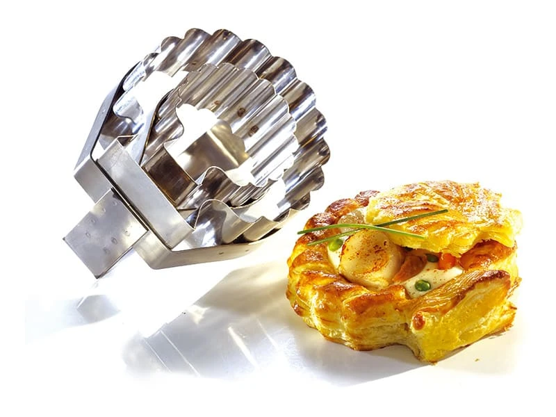 Découpoir à Saint-Jacques double pour bouchées, à poignée, en acier inoxydable 18/10 cannelé, tranchant biseauté.