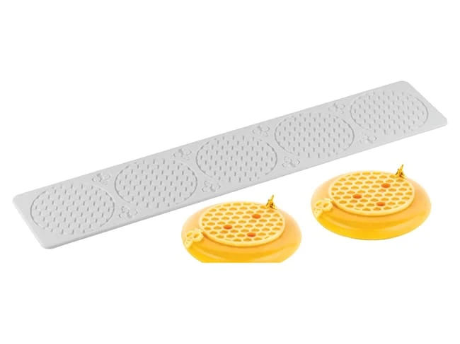 Ce moule en silicone vous permettra de réaliser des décors de forme “nid d’abeille”, en chocolat sans congélation, ou en mousse, crème, confit de fruit, ganache montée… avec congélation.