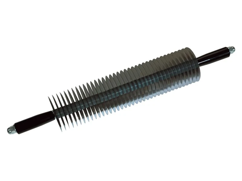 Coupe-bandes pour tartes grillées, 39 lames de Ø 9,6 cm en inox, montées sur une tige démontable, variation de la largeur des bandes en jouant sur la répartition des rondelles intercalaires en plastique.
