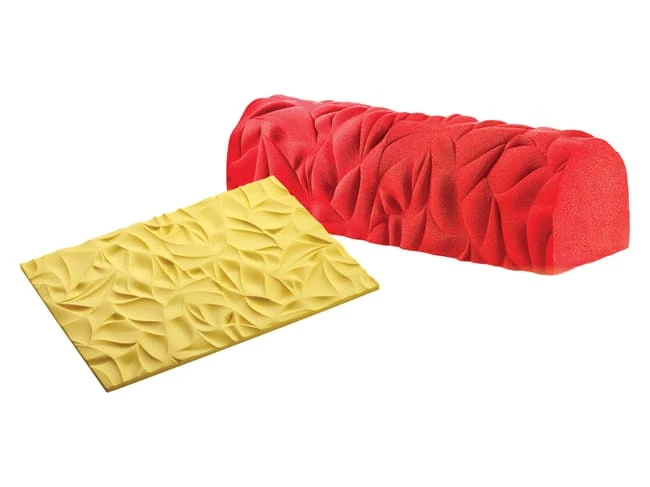 Son utilisation est d’une grande simplicitĂ©: placez le tapis (face texturĂ©e vers le haut) dans un moule Ă bĂ»che de la mĂŞme taille et Ă©talez la pâte ou le bavarois sur votre plan de travail.